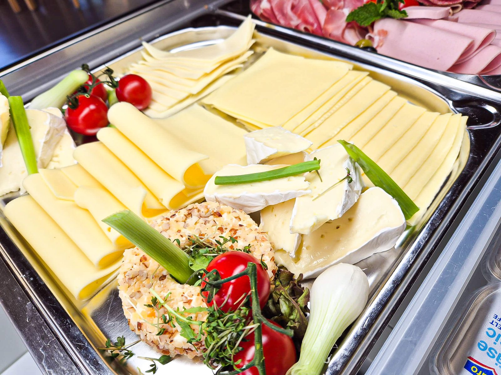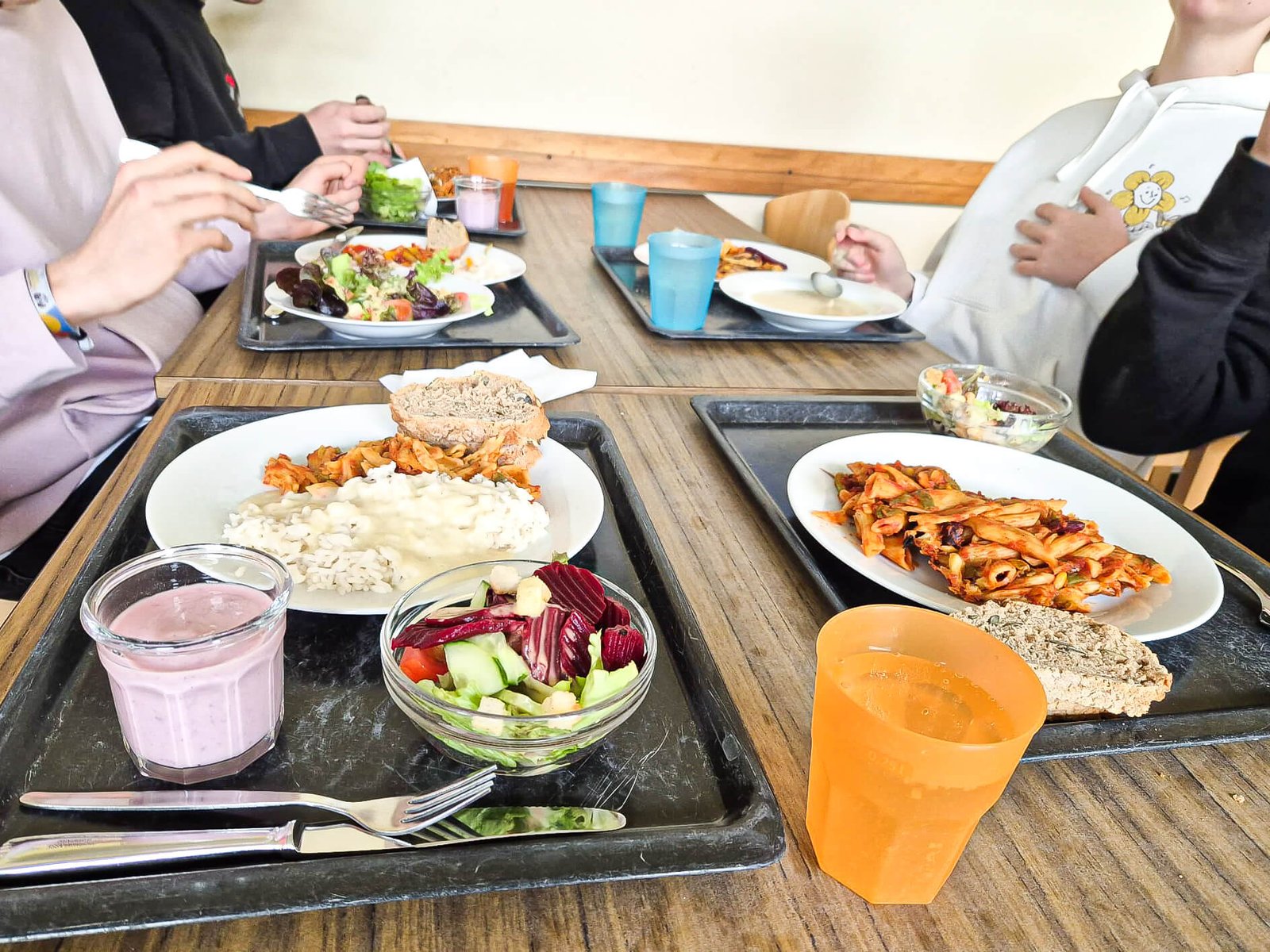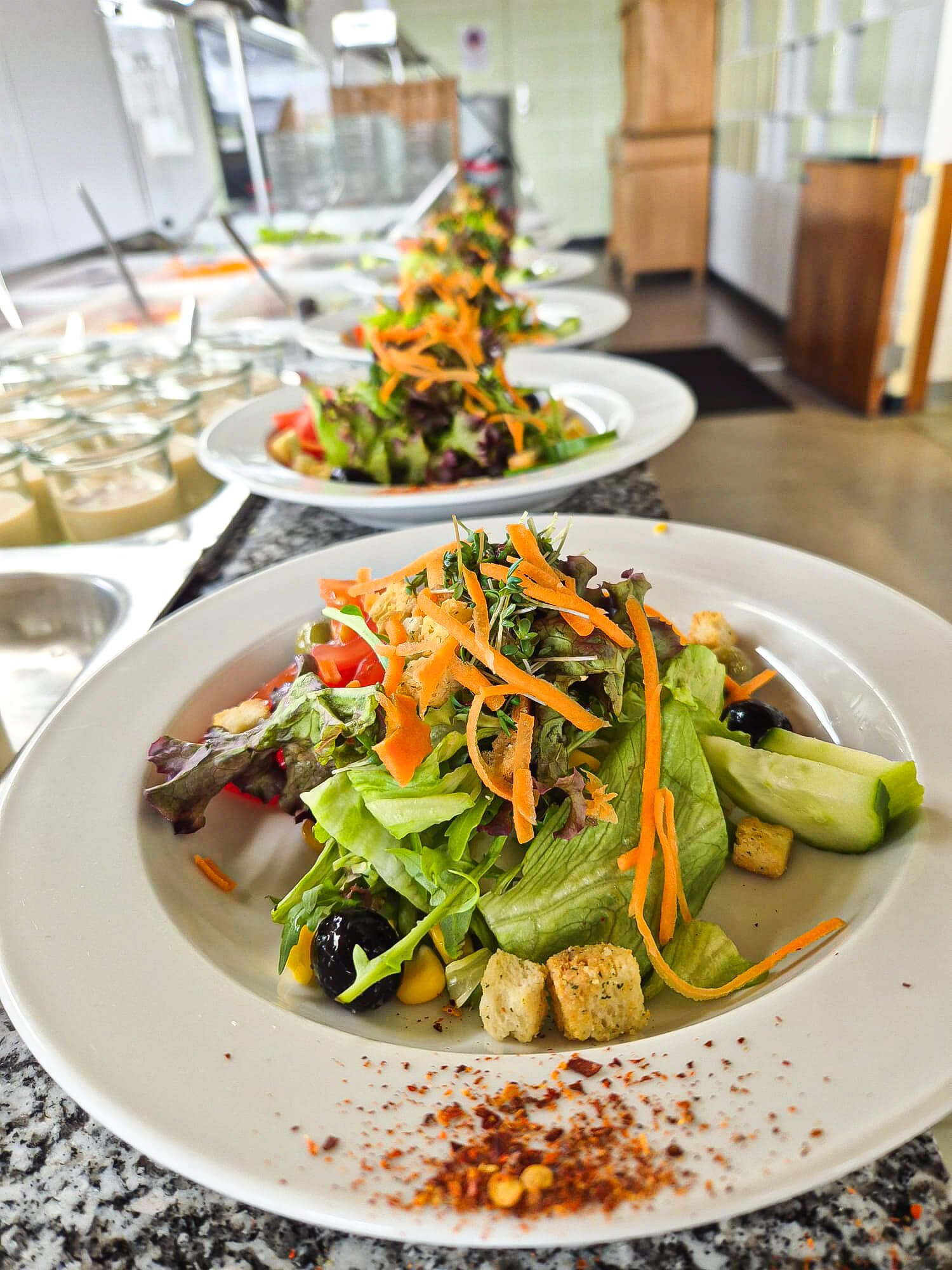 In unserer Mensa wird täglich mit Sorgfalt und Frische eine breite Palette von rund 200 Mittagsessen zubereitet. Diese Vielfalt spiegelt sich nicht nur in der Auswahl der Gerichte wider, sondern auch in der Berücksichtigung verschiedener Ernährungsbedürfnisse und Geschmäcker. Unser Menü umfasst nicht nur herzhafte Hauptgerichte, sondern auch eine großzügige Salatbar, die mit frischem Gemüse und köstlichen Dressings lockt. Dazu gibt es täglich wechselnde Desserts, die das Mittagessen abrunden. Wir legen besonderen Wert auf die Frische unserer Zutaten und die Saisonalität unserer Speisen, um sicherzustellen, dass unsere Schülerinnen und Schüler bei uns stets hochwertige Mahlzeiten genießen können.